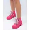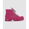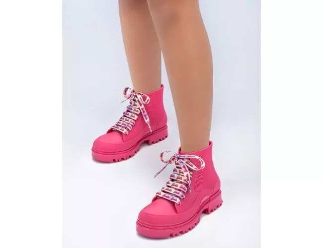 Para a bota escolhemos o coturno, com um visual divertido e fashionista, o atacador é sublimado com elementos que conectam com a estampa da bolsa e é o ponto chave do arquétipo.