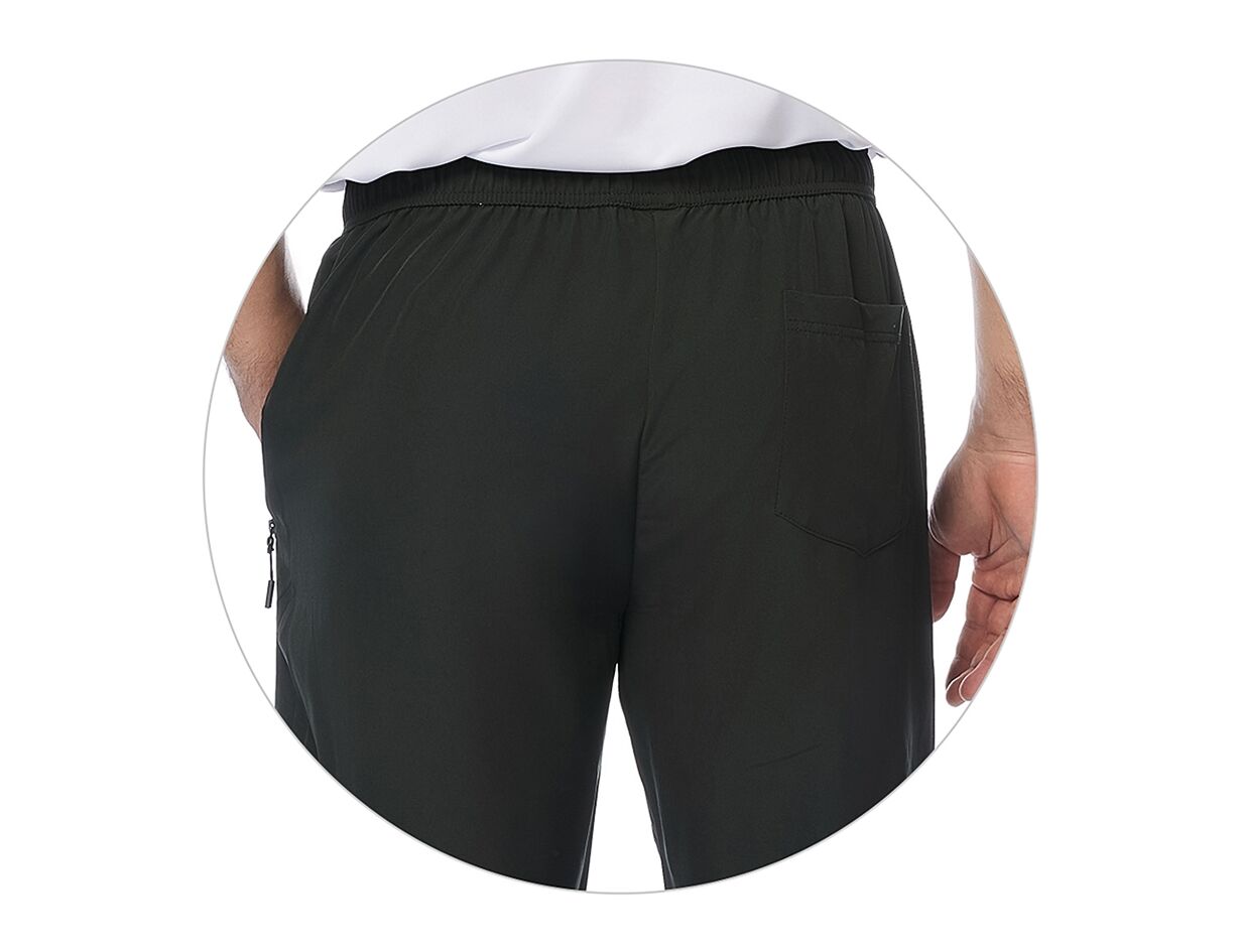 Detalhes: Cós com elástico, cordão ajustável e bolsos funcionais