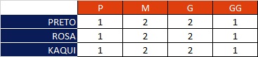 Confira a distribuição de tamanhos e cores em cada caixa: