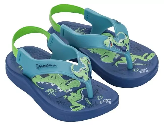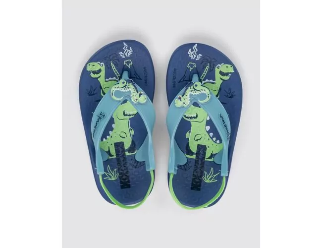 Modelo infantil unissex com grafias exclusivas e enfeites aplicados nas tiras. As versões femininas apresentam estampa delicada de joaninhas e flores, com detalhe em margarida e joaninhas nas tiras. Já as versões masculinas trazem estampa de dinossauros com vulcões e palmeiras, acompanhada por enfeite de dinossauro nas tiras. Produto leve, confortável e de alta aceitação entre o público infantil, com forte potencial de venda para revendedores.