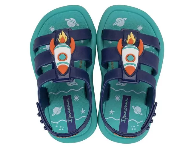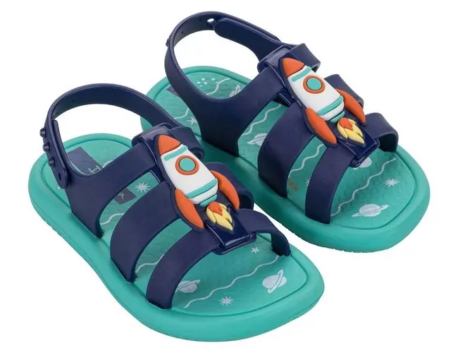 Ipanema Dreamy Baby em duas versões. A primeira traz a temática do verão refrescante, com um aplique de sorvete com detalhes de confetes e até cerejinha. As tiras nessa versão contam com acabamento translúcido perolado. Para a segunda versão o fundo do mar é o protagonista e traz um aplique de um polvo super simpático em seu barquinho. Propostas lúdicas e comerciais.