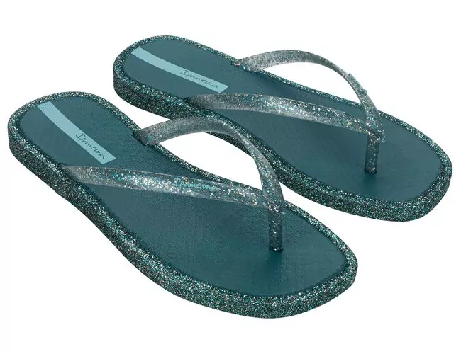 O bico quadrado, já consagrado no mercado, não mostra sinais de desaceleração, se mantendo como diferencial no ponto de venda. Na Ipanema Edge Solar Glow o glitter completa a entrega, com aplicação em toda a lateral da sola e que sobe na lateral da palmilha, super novidade! As tiras, contam com efeito translúcido e injeção de glitter. Duas versões com glitter em degradê.