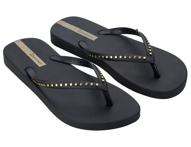 O clássico chinelo de dedo ganha mini tachas metalizadas nas tiras, elemento estético em destaque nos lançamentos que tem como referência a tendência western, nesse lançamento traduzida de forma comercial e moderna.