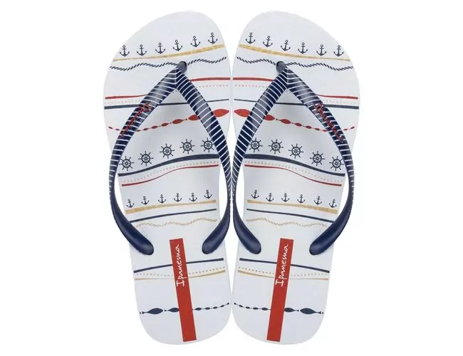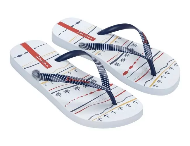 O tema náutico é atualizado na Ipanema Navy com linguagem delicada. Em duas versões os elementos do tema se mesclam criando propostas perenes e com apelo comercial. Alguns detalhes da grafia aparecem metalizados, trazendo ainda mais valor ao produto. As tiras são delicadas e polidas. Uma das versões conta com tira metalizada.
