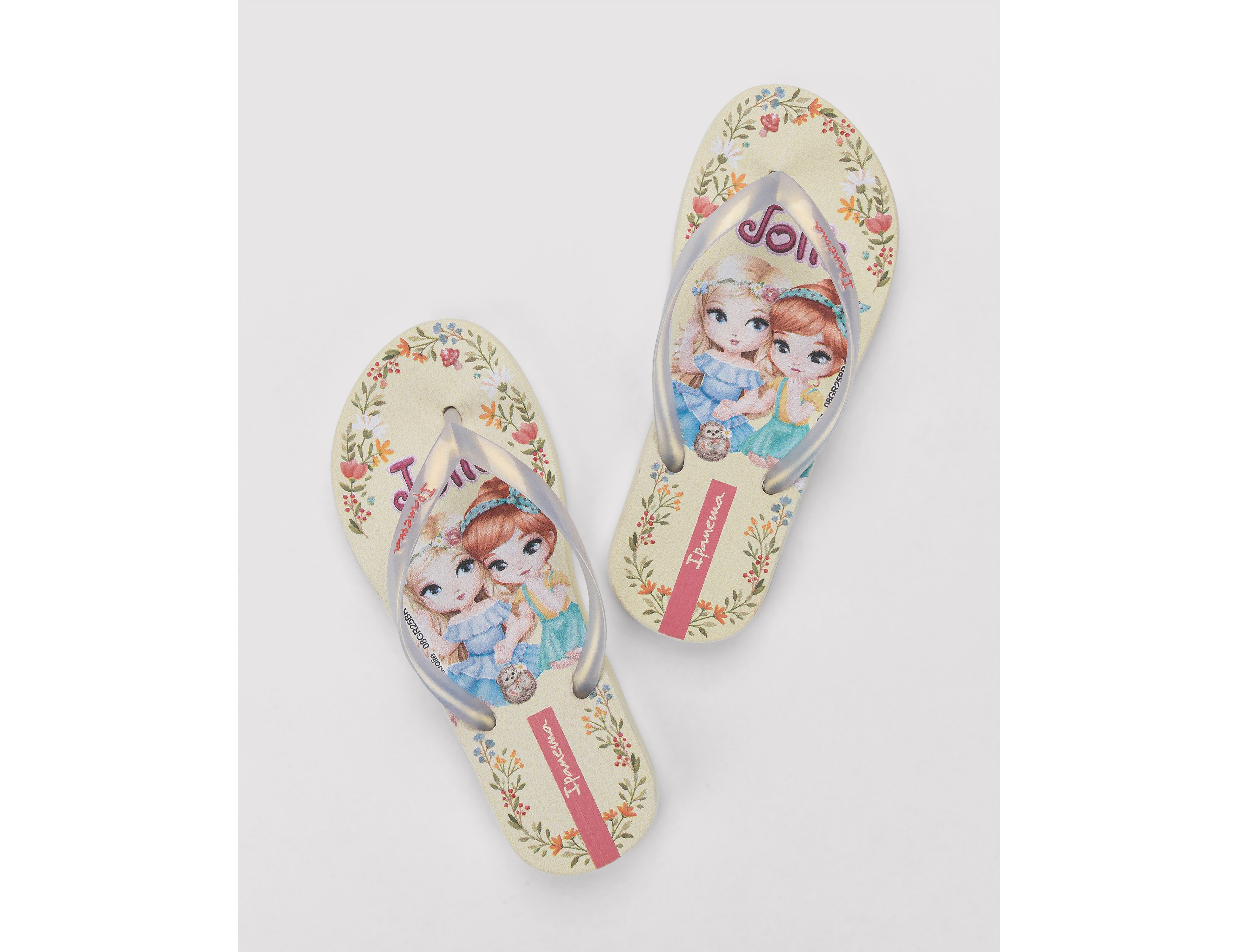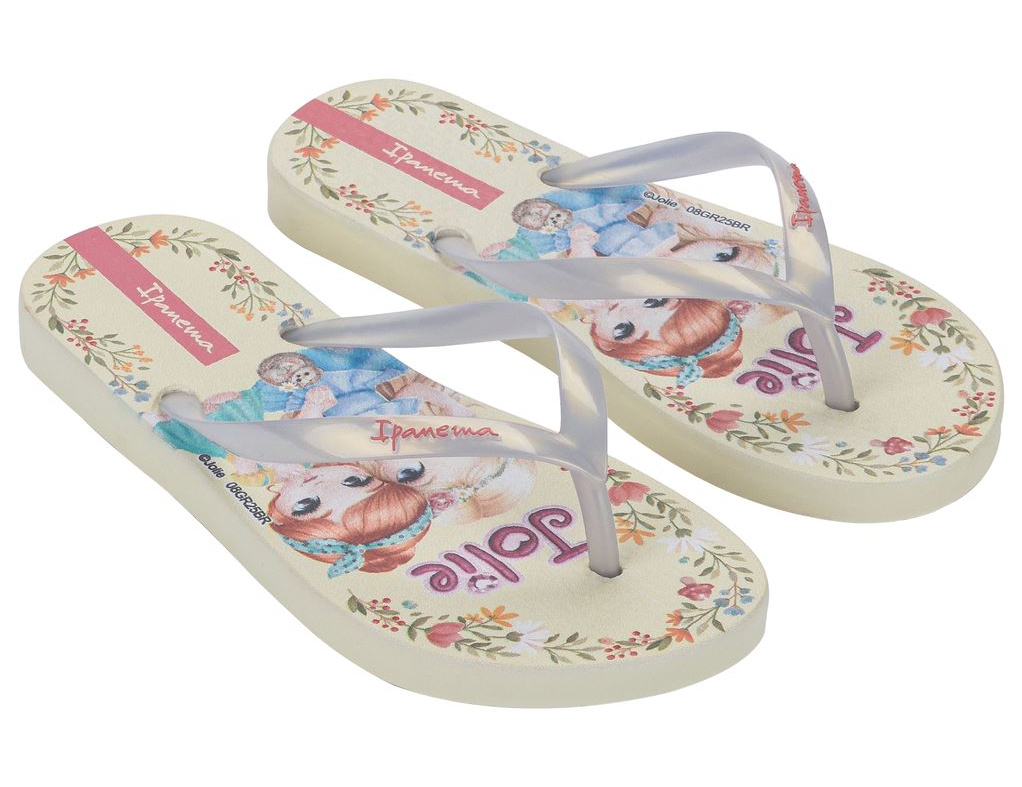 As Meninas mais fofas estampando a Ipanema Jolie Amores, são três personagens da licença Jolie e seus bichinhos de estimação favoritos, em meio a um cenário delicado com inspiração na natureza e as trocas de estação do ano. Para complementar, a tira vem com acabamento perolado e glitter para dar um toque de magia que complementa a estampa da palmilha.