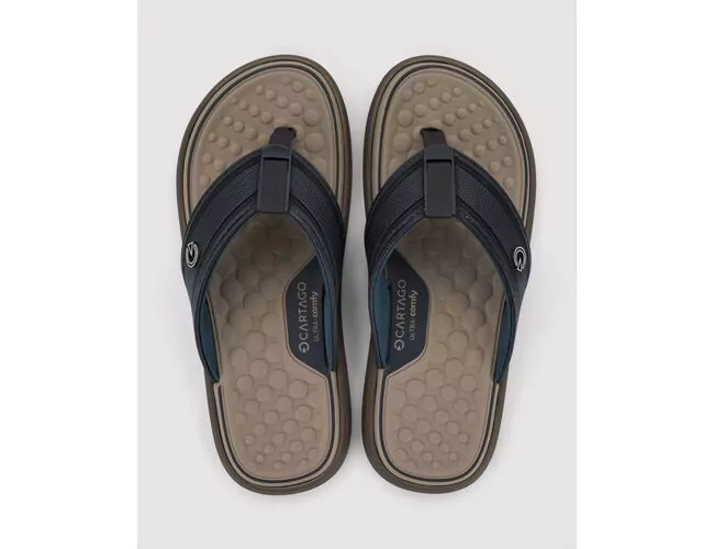 Modelo masculino da linha Cartago, desenvolvido com cabedal forrado em EVA e dedeira têxtil para maior conforto. Possui detalhes em textura e sobreposição que valorizam o design, além de palmilha anatômica com efeito massageador que proporciona bem-estar durante o uso. Solado resistente e de fácil limpeza. Produto versátil, com ótima aceitação no mercado e excelente giro para revenda.
