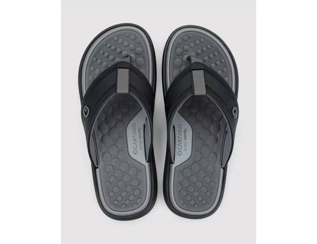Modelo masculino da linha Cartago, desenvolvido com cabedal forrado em EVA e dedeira têxtil para maior conforto. Possui detalhes em textura e sobreposição que valorizam o design, além de palmilha anatômica com efeito massageador que proporciona bem-estar durante o uso. Solado resistente e de fácil limpeza. Produto versátil, com ótima aceitação no mercado e excelente giro para revenda.