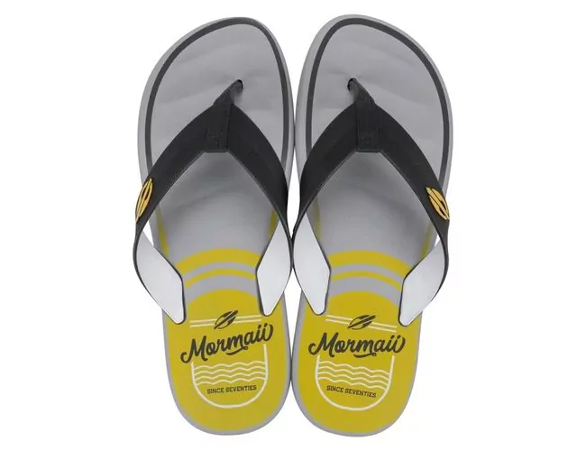 O Mormaii Tai Dedo Ad é um chinelo de dedo com forquilha texturizada, mimetizando uma construção têxtil com serigrafia interna. Sola de EVA com uma serigrafia clássica Mormaii no calcanhar, contemplando também uma estampa estilo carimbo remetendo a Garopaba. Possui gomos de conforto e sola tratorada. Um produto masculino de estilo casual, propício para o dia a dia na praia ou na cidade.