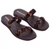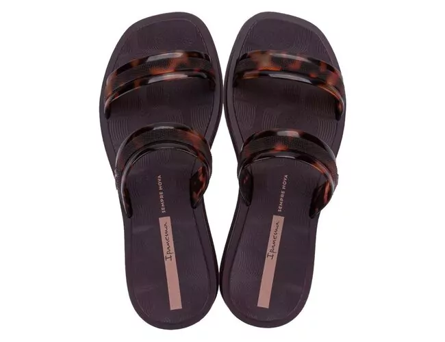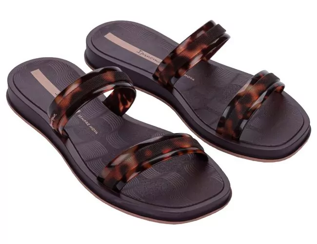 Traz duas tiras com superfície de tartaruga, com detalhe de uma tira texturizada e transparente sobreposta, criando um efeito que permite visualizar a estampa tartaruga através da textura. Na palmilha das solas, uma textura inspirada na calçada da Ipanema e nas ondas do mar, de uma forma geométrica e padronizada.