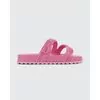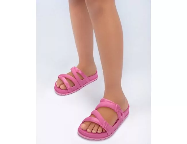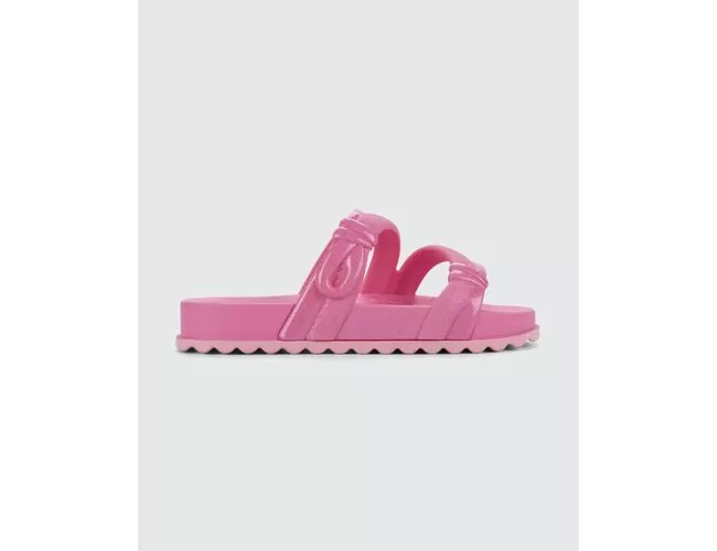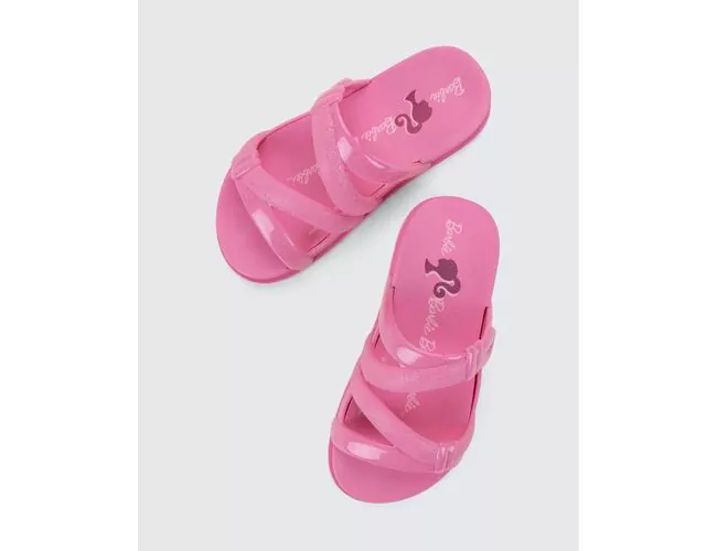 Acompanhando o sucesso do nosso Barbie Allure, em 2025 trazemos uma nova interpretação de tiras cruzadas para o slide no estilo birken. Aqui, olhamos para referências de grandes marcas como Loewe e Bottega Veneta, trazendo o ícone do nó como ponto focal do produto. Esse novo cabedal, em PVC full plastic, explora as texturas laser combinadas a regiões polidas, fazendo um transpasse de tiras mais robustas abauladas com junções por meio de elos formados por cordas finas que fazem o detalhe do amarrado. Como destaque a tira do peito do pé recebe, além da amarração, um laço simples que traz delicadeza para o arquétipo. Como complemento, a sola contempla pintura degradê em duas cores e também arte em serigrafia fazendo assinatura Barbie.
