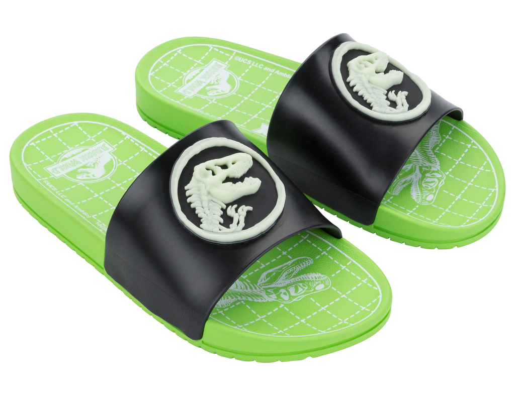 Explorando diferentes estilos, trazemos duas versões de chinelo para os pequenos amantes de Jurassic Park: o camuflado aventureiro e o neon do cyberpunk. Na primeira versão, o camuflado dá personalidade ao calçado, criando uma estética aventureira. A segunda versão, traz uma estética inspirada no raio-X e nos fósseis dos dinossauros com uma arte neon.