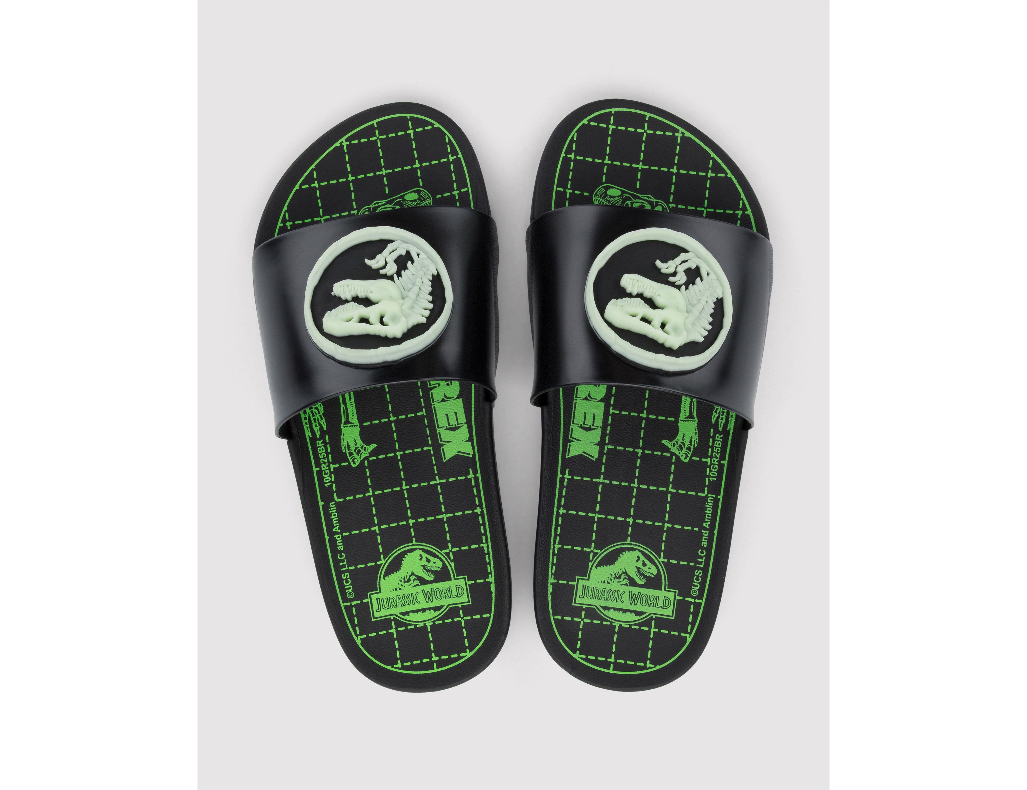 Explorando diferentes estilos, trazemos duas versões de chinelo para os pequenos amantes de Jurassic Park: o camuflado aventureiro e o neon do cyberpunk. Na primeira versão, o camuflado dá personalidade ao calçado, criando uma estética aventureira. A segunda versão, traz uma estética inspirada no raio-X e nos fósseis dos dinossauros com uma arte neon.