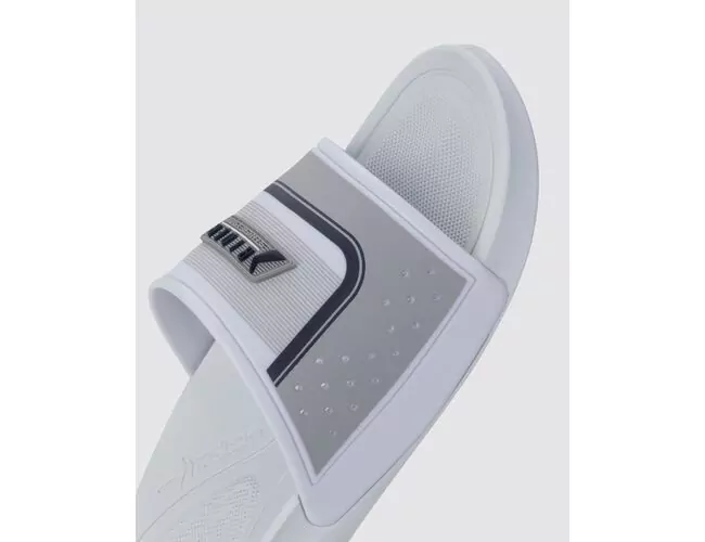 O Smash Slide continua explorando as linhas e composições geométricas nessa nova versão, mas agora com ainda mais detalhamento, já que a gáspea combina serigrafia com sobreposição em PVC, ganhando como acabamento uma etiqueta em plastisol. Na palmilha, a bolacha de conforto no calcanhar traz texturas de perfuros, que aumentam a sensação de conforto e maciez, afirmando o Smash como um slide básico, mas cheio de estilo, perfeito para todos os momentos.