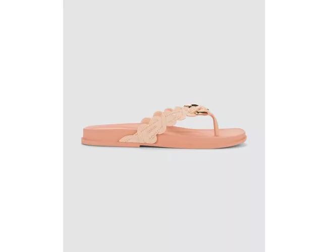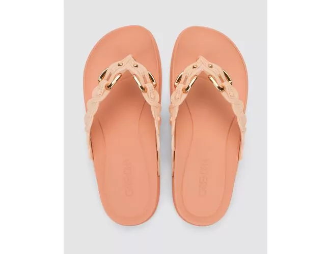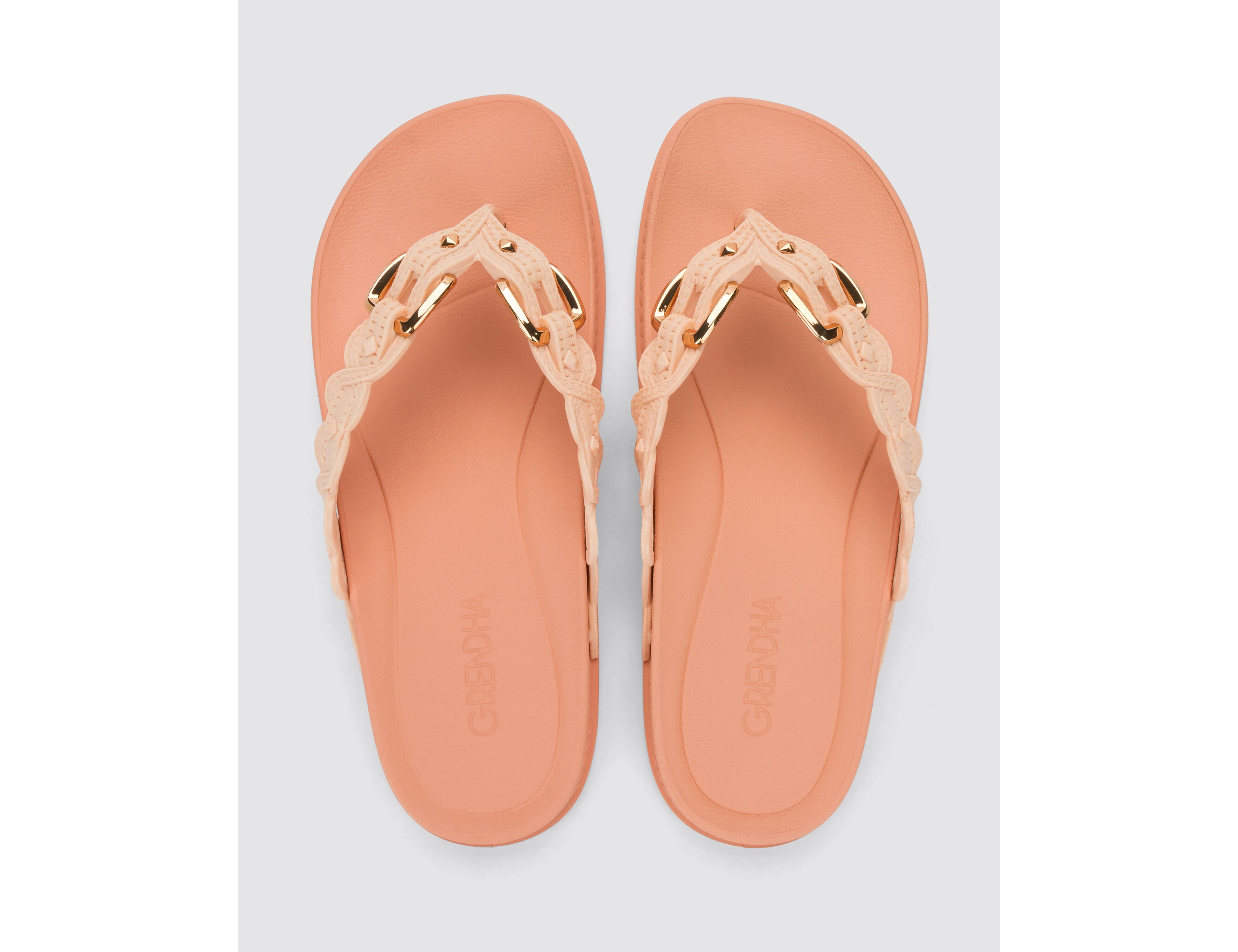 Modelo com sola anatômica Abraçar, repaginada com tiras em efeito entrelaçado que remetem ao couro. Detalhes em passante metalizada e tachas delicadas trazem sofisticação e valorizam a trama. Produto moderno, versátil e com forte apelo comercial para o público feminino.