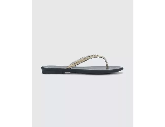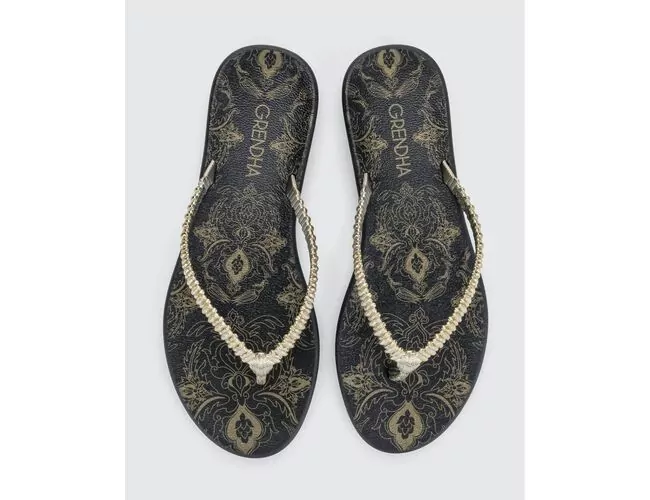 A estética boho retorna com força e destaca estampas ligadas ao estilo étnico característico da Grendha, como o clássico Paisley. O design da forquilha é inspirado na joalheria, remetendo a colares e pulseiras. O acabamento facetado adiciona delicadeza e sofisticação ao visual, tornando a sandália um item cheio de personalidade.
