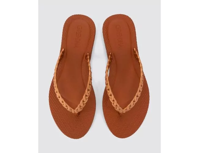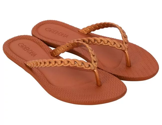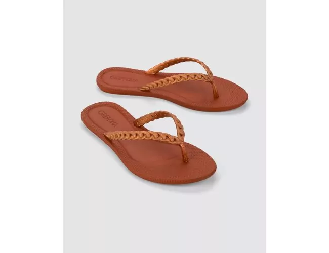 Diferentes tipos de texturas entregam novos efeitos para uma tendência que segue constante nas passarelas, inspirando o novo rasteiro de Grendha que traz as correntes como elemento de destaque por toda a forquilha.