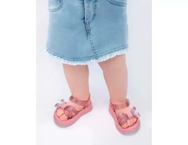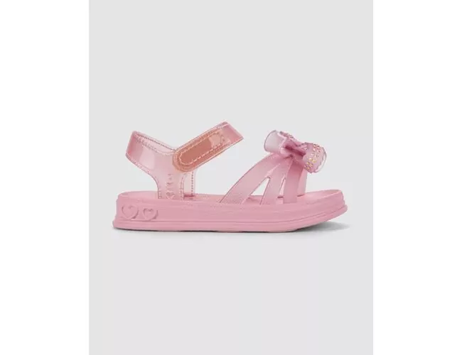 O charme da nova sandália baby de Grendene é evidenciado pelas tiras finas da gáspea que se entrelaçam e envolvem os pezinhos de maneira delicada, sem perder o conforto e estabilidade. O ponto de luz do arquétipo está no laço que simula mini cristais cravejados, a assinatura da licença, complementa a personalização do aplique, o brilho fica por conta da aplicação de hotstamp em todas essas volumetria. Com fechamento de velcro que facilita o calce, o traseiro possui todo o detalhamento de babados, que remetem as bordas de fitas têxteis artesanais, criando um efeito visual ainda mais delicado para o arquétipo, trazendo um ar romântico e ludicidade ao produto. O solado flatform, se inspira nas linhas mais retas, sem deixar de trazer identidade ao produto, com volumetrias de coração na lateral da sola, uma linha delicada circunda toda a sola e abraça os corações, a nova proposta de sola faz um mix entre altura e conforto, trazendo volumetrias que simulam uma palmilha.