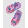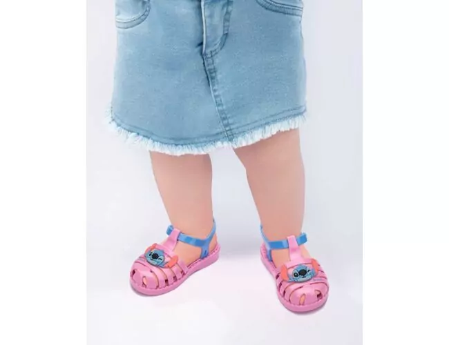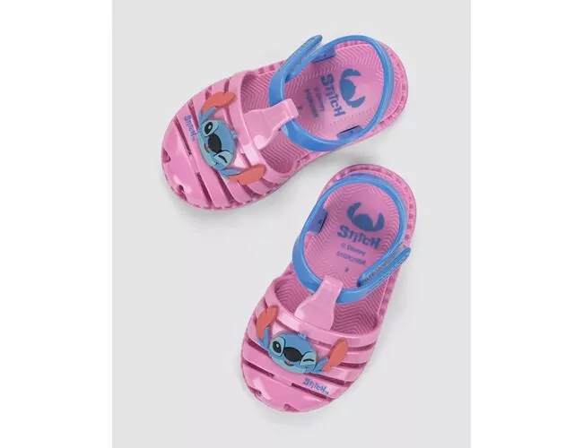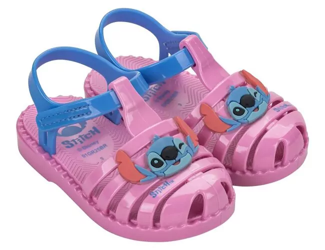 A clássica sandália Duo com o personagem Stitch também disponível na grade baby e com a mesma cartela de cores da versão infantil.