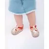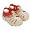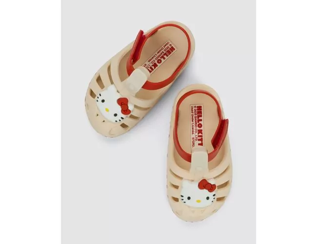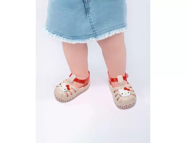 Nosso modelo de sucesso baby para a licença Hello Kitty com destaque para o rosto da personagem em plastisol e rotografia poá divertida envolvendo a sola, trazendo um toque de cor importante, que também é diferencial de produto.