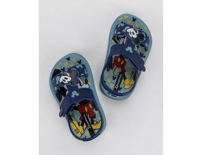 Sandália baby com fechamento por aderência. Vários personagens ganham vida neste produto com lindas grafias na sola e enfeite na parte frontal destacando as principais propriedades como: Stitch, Marie, Carros e os clássicos Mickey e Minnie.