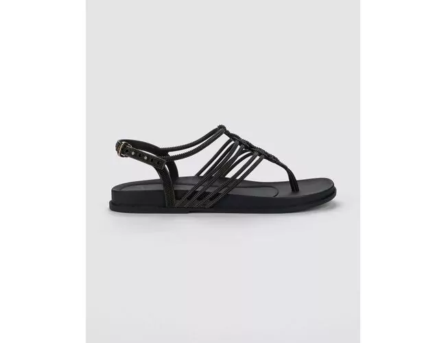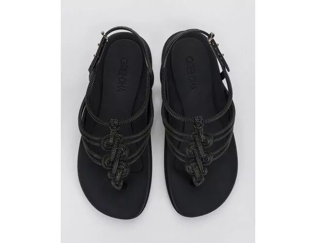 Trançados elaborados e inusitados formam a salomé da nova sandália de Grendha. Suas múltiplas tiras recebem acabamento sofisticado do glitter suave. O fechamento em fivela e o solado anatômico agregam funcionalidade ao lançamento.