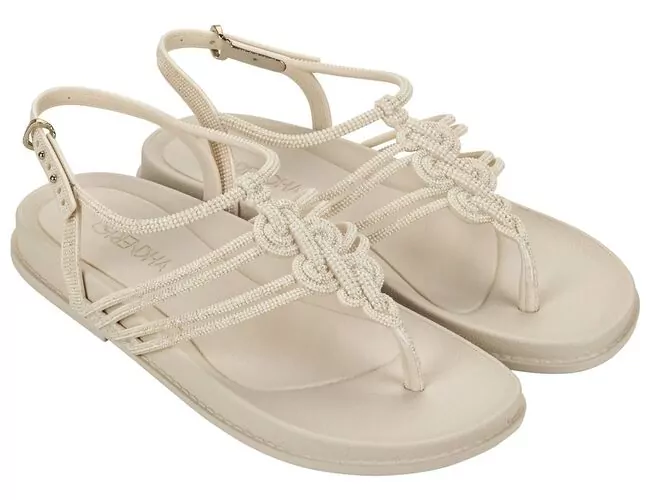 Trançados elaborados e inusitados formam a salomé da nova sandália de Grendha. Suas múltiplas tiras recebem acabamento sofisticado do glitter suave. O fechamento em fivela e o solado anatômico agregam funcionalidade ao lançamento.