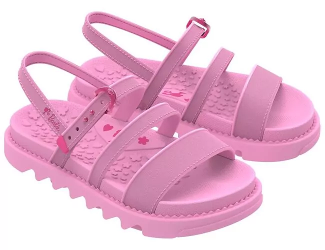 A nova sandália Barbie traz a tendência das tiras ultrafinas para o cabedal que fazem contraponto com a sola robusta de linhas anatômicas e evidentes. Com sola em EVA injetado, perfil tratorado shark e palmilha com regiões massageadoras, e cabedal em PVC full plastic, todo trabalhado com texturas de couro, vivo francês e fechamento por fivela em nylon com metalização encaixada. A personalização da licença está presente tanto no cabedal como na palmilha, com arte em serigrafia da assinatura Barbie e Siloheads.