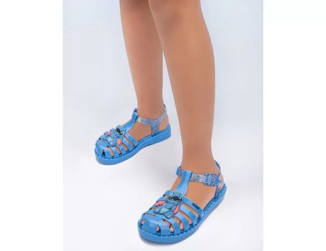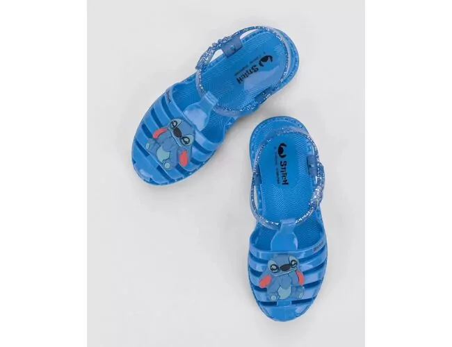 Nossa clássica sandália aranha infantil com o personagem do momento: Stitch! Ela está disponível na cor clássica do personagem e também nas variantes rosa, branco perolado e translúcidas com glitter.