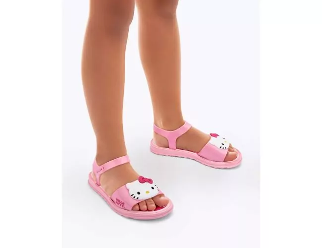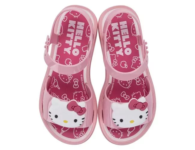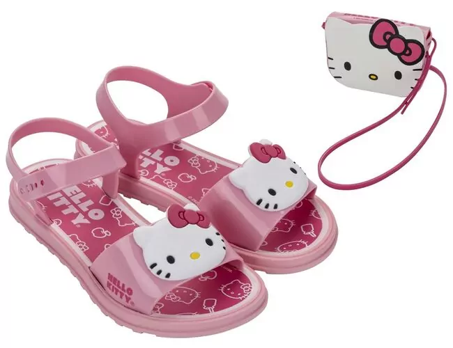 A personagem mais amada pelas crianças está chegando em Grendene Kids com um promocional que é a cara dela! Uma linda bolsinha tiracolo com aplique no formato do rosto da personagem, com as orelhas e o laço destacados para fora da bolsa, dando mais valor e criando um efeito tridimensional, além da presença do logo em destaque no topo da bolsa. Para a sandália, trazemos um arquétipo confirmado, com gáspea e traseiro com tiras confortáveis e delicadas, um aplique volumétrico em plastisol no formato do rostinho da personagem e aplicação do logotipo na lateral externa. Valorizando o enfeite do cabedal, trazemos uma palmilha mais delicada com a presença de personagem e seus objetos favoritos como o lacinho, o copo de leite e a maçã. Agora toda menina pode brincar de ser a Hello, com conforto e diversão!