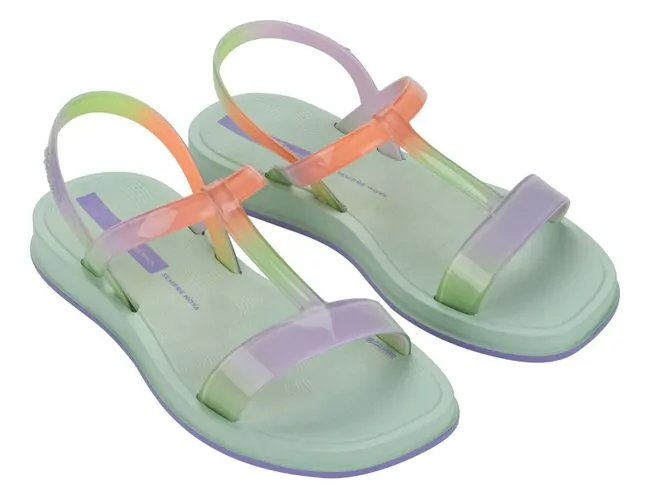 Traz nas tiras uma proposta mais divertida e colorida, em um gradiente de cores contrastantes. Também traz pontos de cor na palmilha e na soleta. A sola quadrada e a altura de salto maior são detalhes em alta na moda! O salto maior deixa a sola mais macia na região do calcanhar e proporcionando mais ergonomia e conforto no caminhar. Na palmilha das solas, uma textura inspirada na calçada da Ipanema e nas ondas do mar, de uma forma geométrica e padronizada.