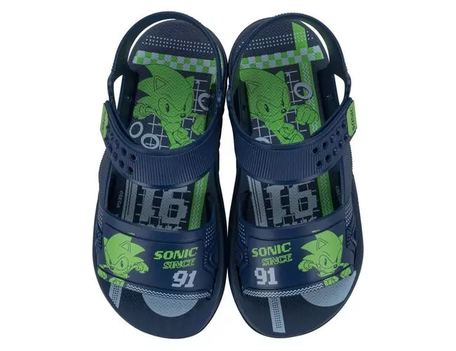 A nova sandália Sonic de Grendene Kids traz o ouriço mais rápido dos games em uma estampa exclusiva, que mostra os elementos da estética vintage do game lançado em 1991. Com ícones característicos do personagem e do jogo, a estampa trabalha elementos como os anéis, os raios e além disso, apresenta grafismos geométricos dos anos 90, que trazem a nostalgia e diversão do jogo em sua época de lançamento.