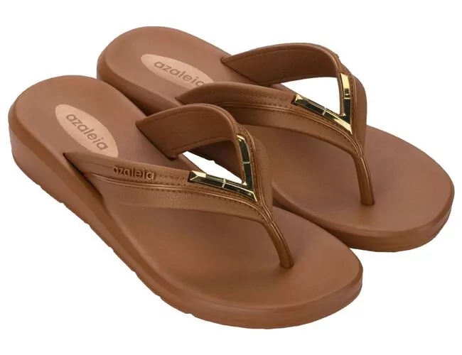 A tendência Simplicidade Inteligente reformula o desenvolvimento de produtos, resultando em criações personalizadas com design perene uma proposta que veio para ficar. Azaleia Cloe reinventa o enfeite metálico que atravessa o entremeio das tiras. Diferentes acabamentos fosco, brilhoso e metalizado evidenciam o cuidado com cada detalhe.
