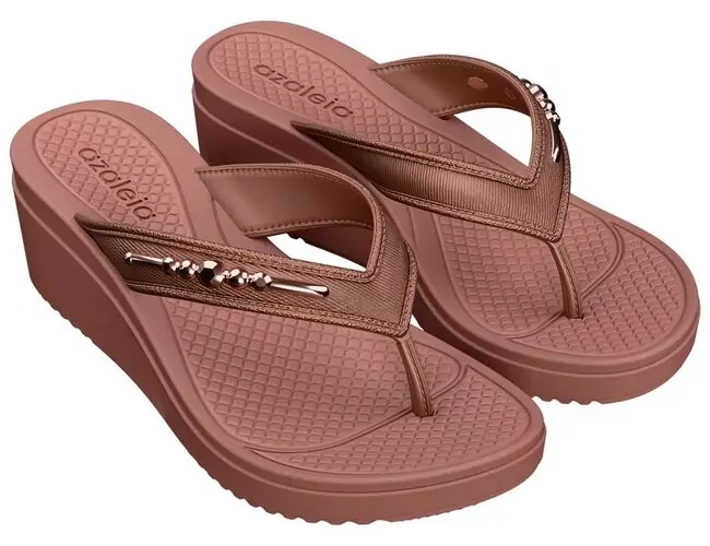 Uma nova geração de itens essenciais destaca os metais como destaque nos acessórios de couro. O tamanco anabela surge com um enfeite alongado, agregando sofisticação ao design. O solado leve em EVA, com formato anabelado, já consolidado em vendas, reforça o conforto e a identidade da marca.