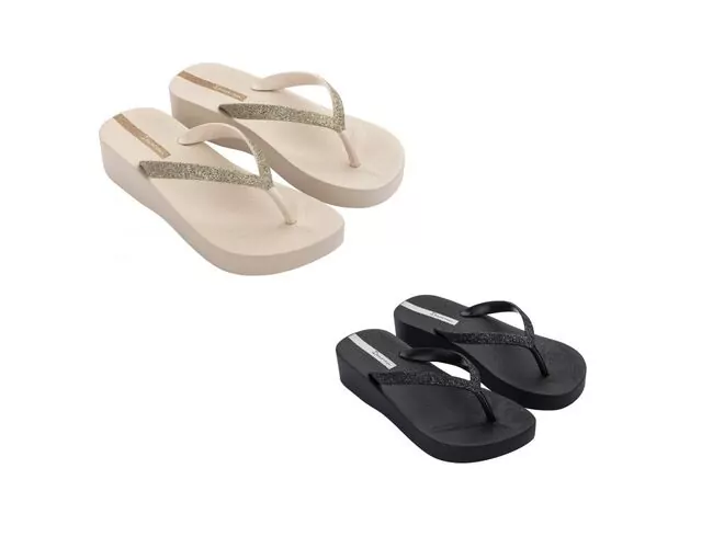 Um flip chinelos com platô ipanema com um estilo fascinante perfeito! As tiras são embelezadas com elementos de glitter, que adicionam um toque brilhante e feminino.